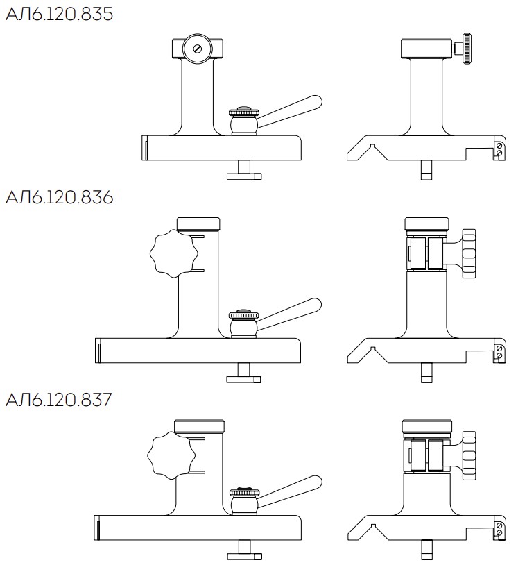 Рейтеры предназначены для установки элементов оптических схем на держателях (колонках) 15, 24 или 30 мм. Перед установкой рейтера на станину кольцо устанавливают таким образом, чтобы стрелка, нанесенная диаметрально, совпадала с направлением паза станины, в который вставляется хвостовик зажимного винта. Рейтер устанавливают на станину, поворачивают кольцо до отказа в сторону, указанную стрелкой с надписью «Зажать», и закрепляют рейтер поворотом зажимной рукоятки. Для снятия рейтера со станины без протягивания его через всю длину станины проделывают вышеописанный процесс в обратной последовательности. Рейтеры заканчиваются колонкой, диаметр отверстия которой равен 15 мм (АЛ6.120.835), 24 мм (АЛ6.120.836), 30 мм (АЛ6.120.837). Внутри колонки может быть закреплена стойка столика, оправы и осветителя. Для зажима стойки в необходимом положении по высоте на колонке имеется зажимной винт. На рейтере имеется индекс для определения положения рейтера вдоль станины.